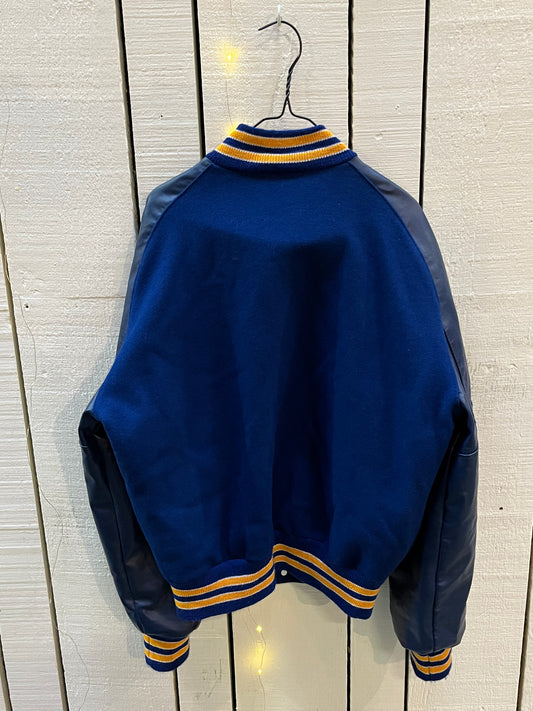 Todd & Moore Inc. Delong Blue and Yellow Wool and Leather Varsity Jacket, Chest 44”