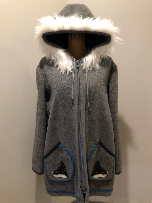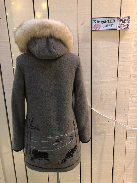 Vintage James Bay Grey Wool Northern Parka with Seal Motif, Made in Canada SOLD