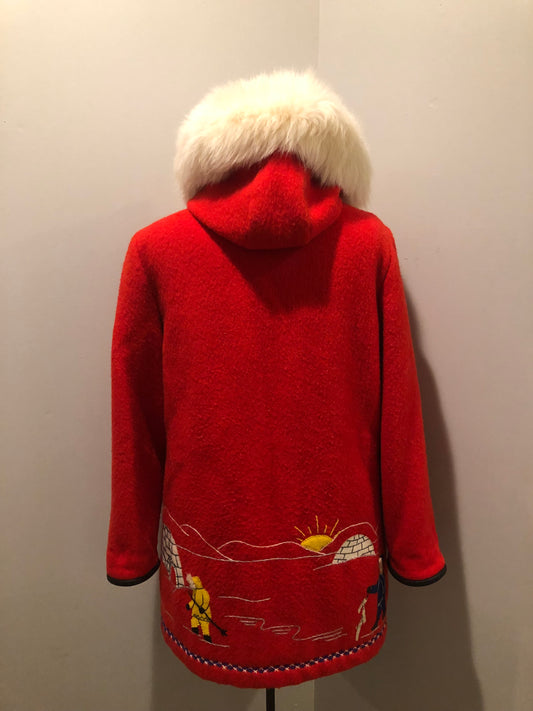Vintage James Bay Red Wool Northern Parka with Fur Trimmed Hood, Made in Canada