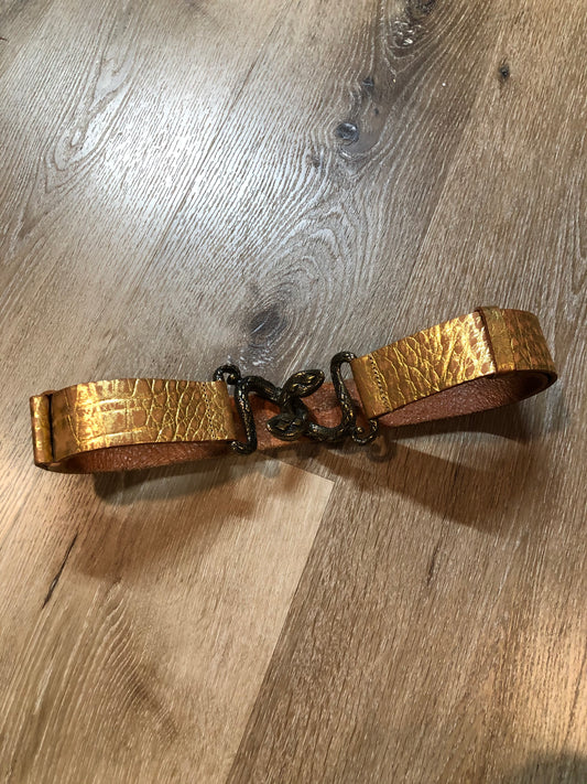 Gold Croc-Embossed Leather Belt with Snake Buckle