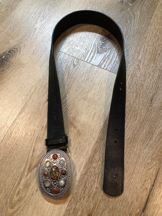 Brown Leather Belt with Floral Tooling and Stone Buckle, SOLD