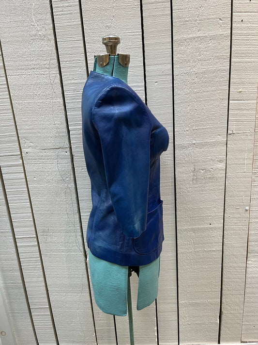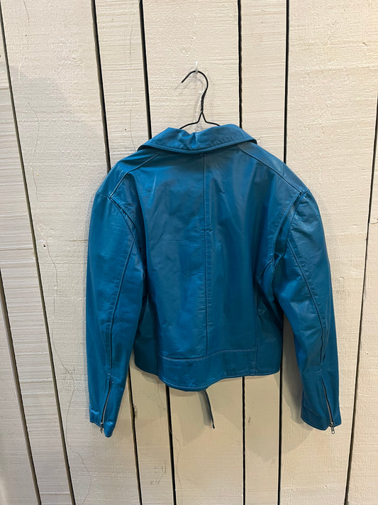 Vintage Fashions by Rose Teal Blue Leather Moto Jacket, Made in USA, Size 12