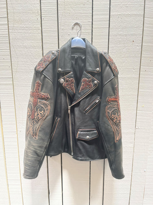 Vintage Bootmaster Skull and Gator Black Leather Motorcycle Jacket, Made in Mexico, Size Large SOLD