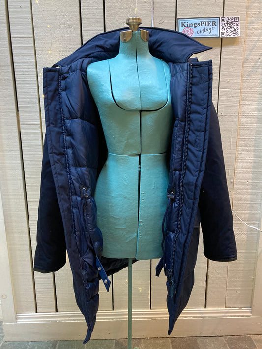 Vintage Northern Spirit Navy Blue Down-Filled Parka with Coyote Fur Trimmed Hood, Size 44