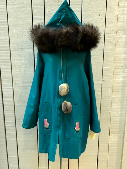 Vintage Teal Northern Parka with Fur Trimmed Hood, Pom Poms and Hand Embroidered Details, Chest 46”