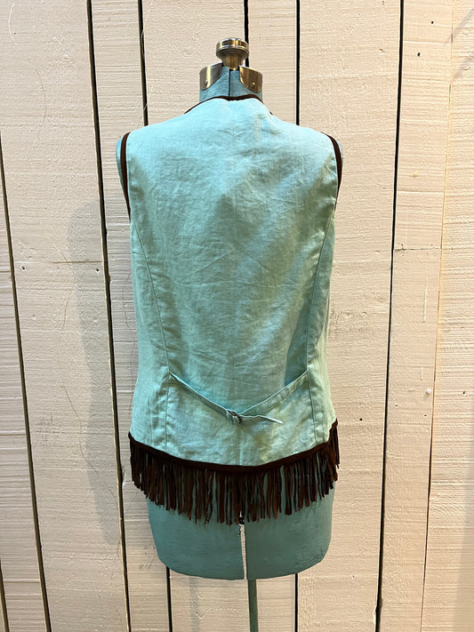 Double D Ranch Green Goat Suede Vest with Fringe and Beaded Western Motif, Made in India, Size Medium SOLD