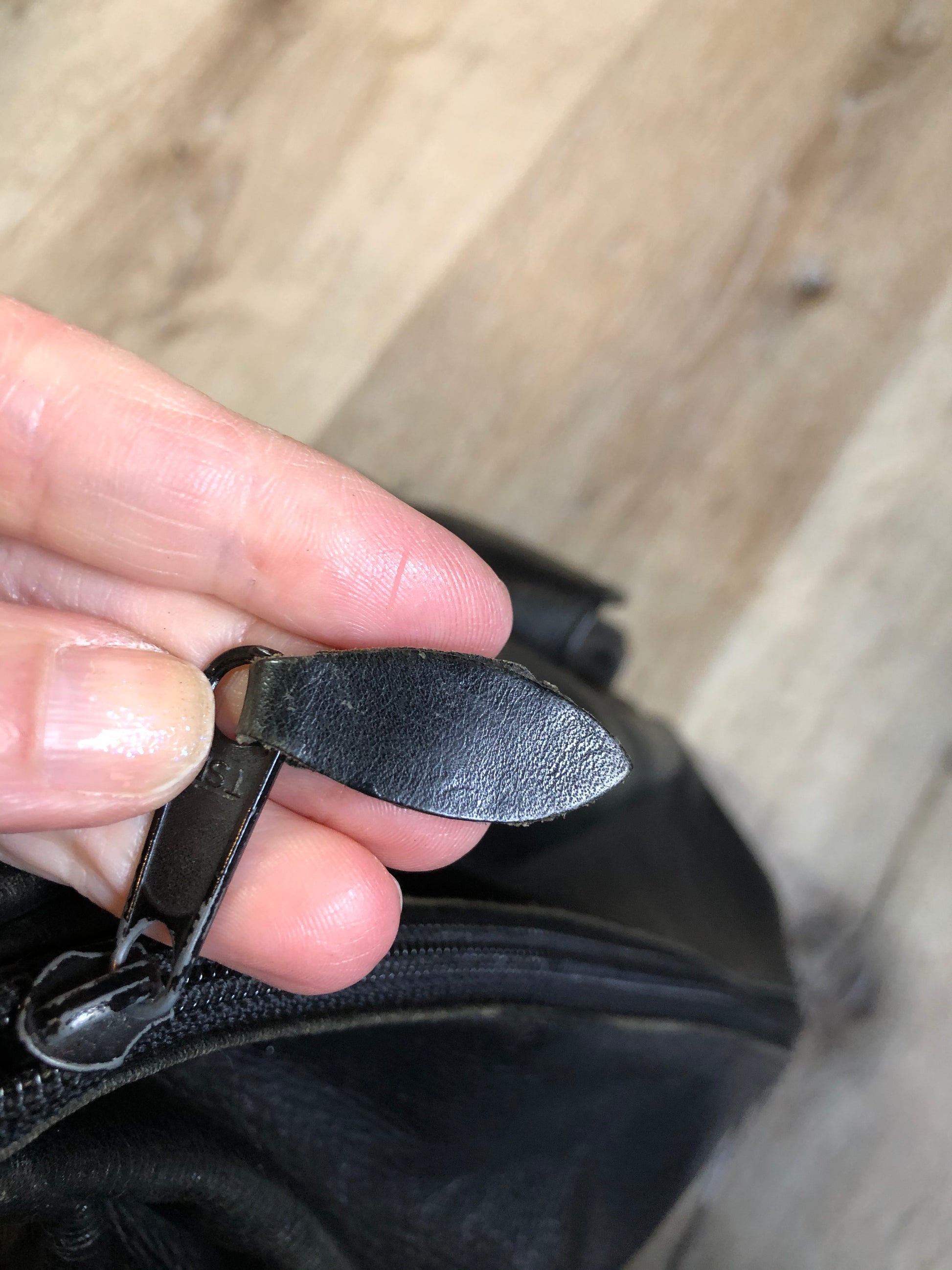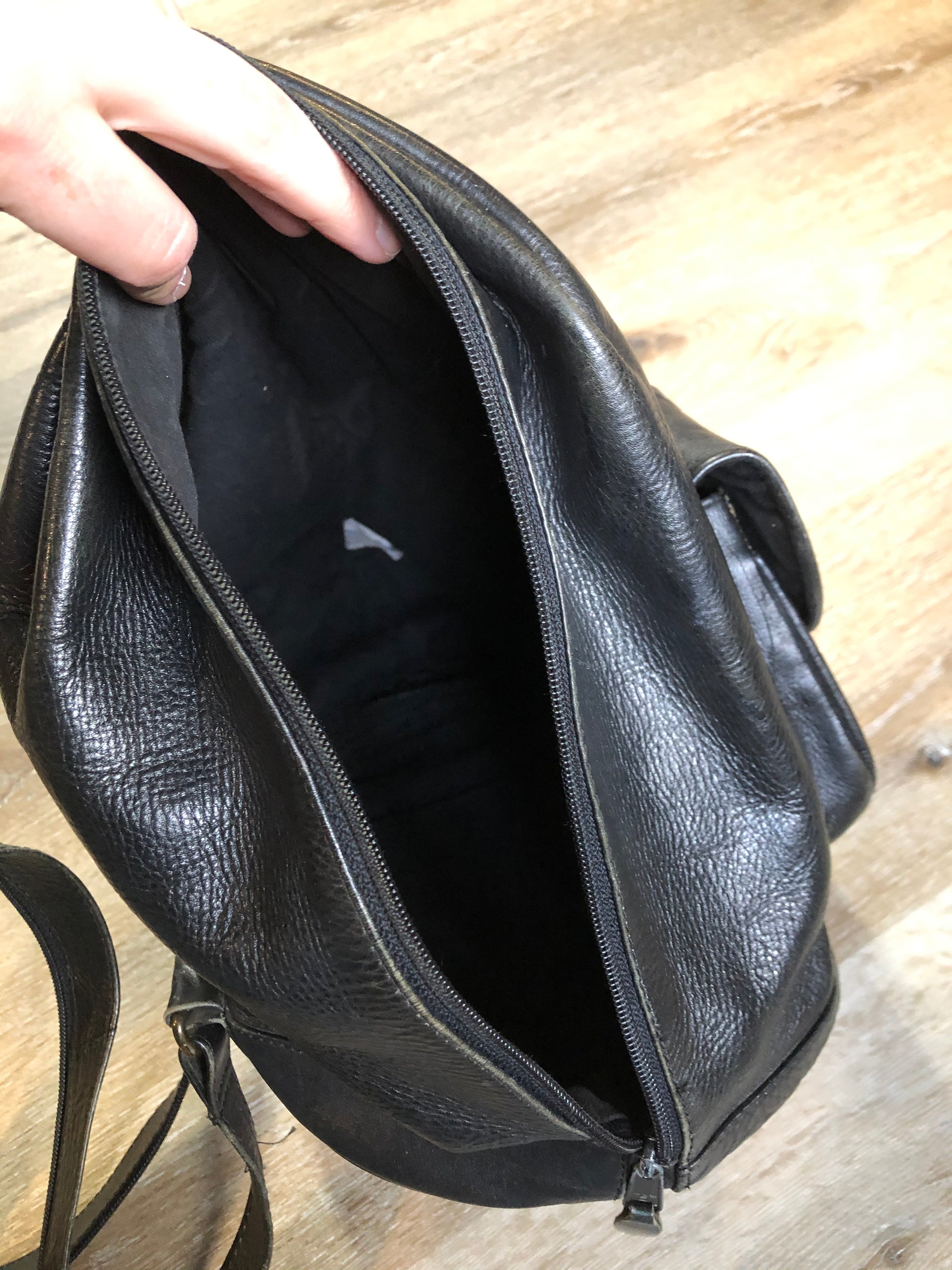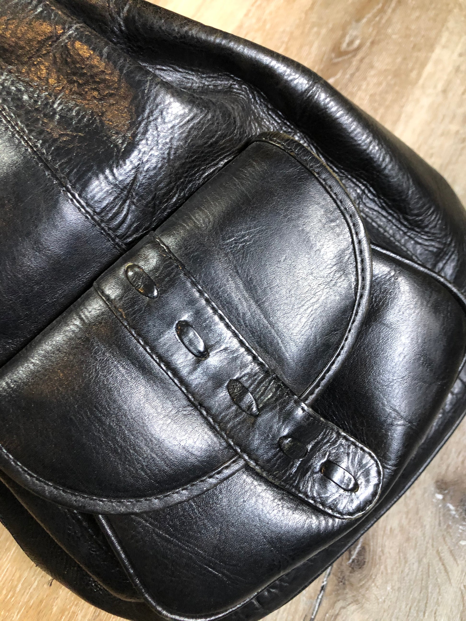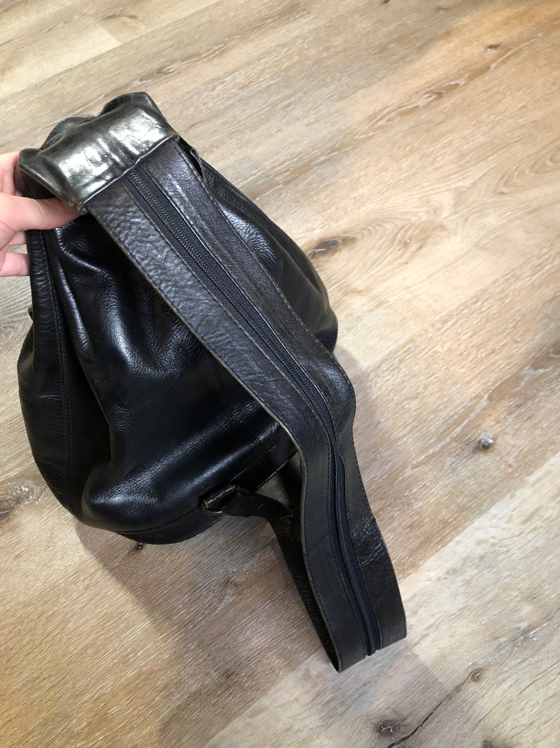 Vintage 90’s Jane Shilton black leather backpack with leather stitching details, one exterior compartment, side zip entrance and shoulder straps can be zipped together to make one crossbody strap. Made in Canada.