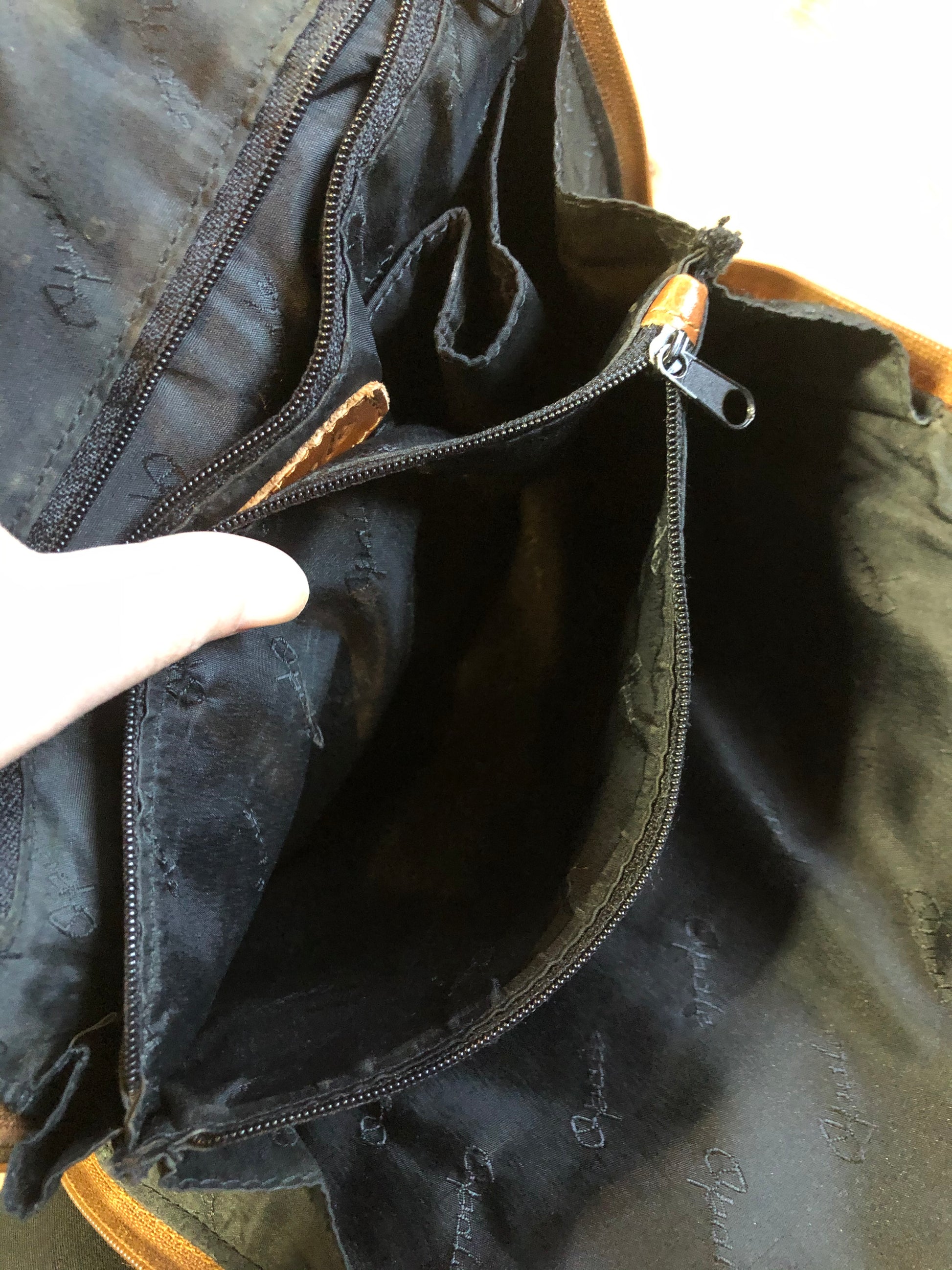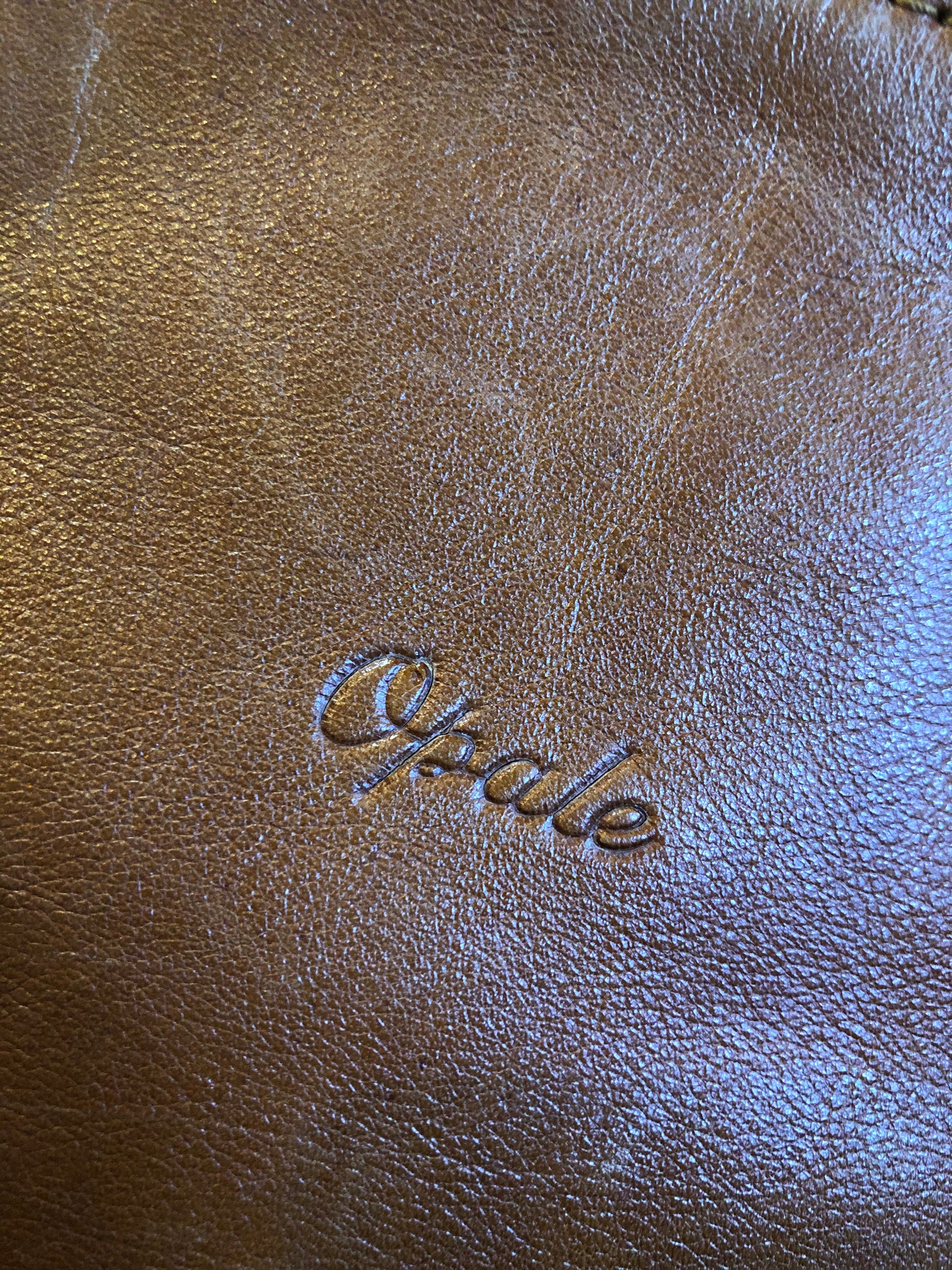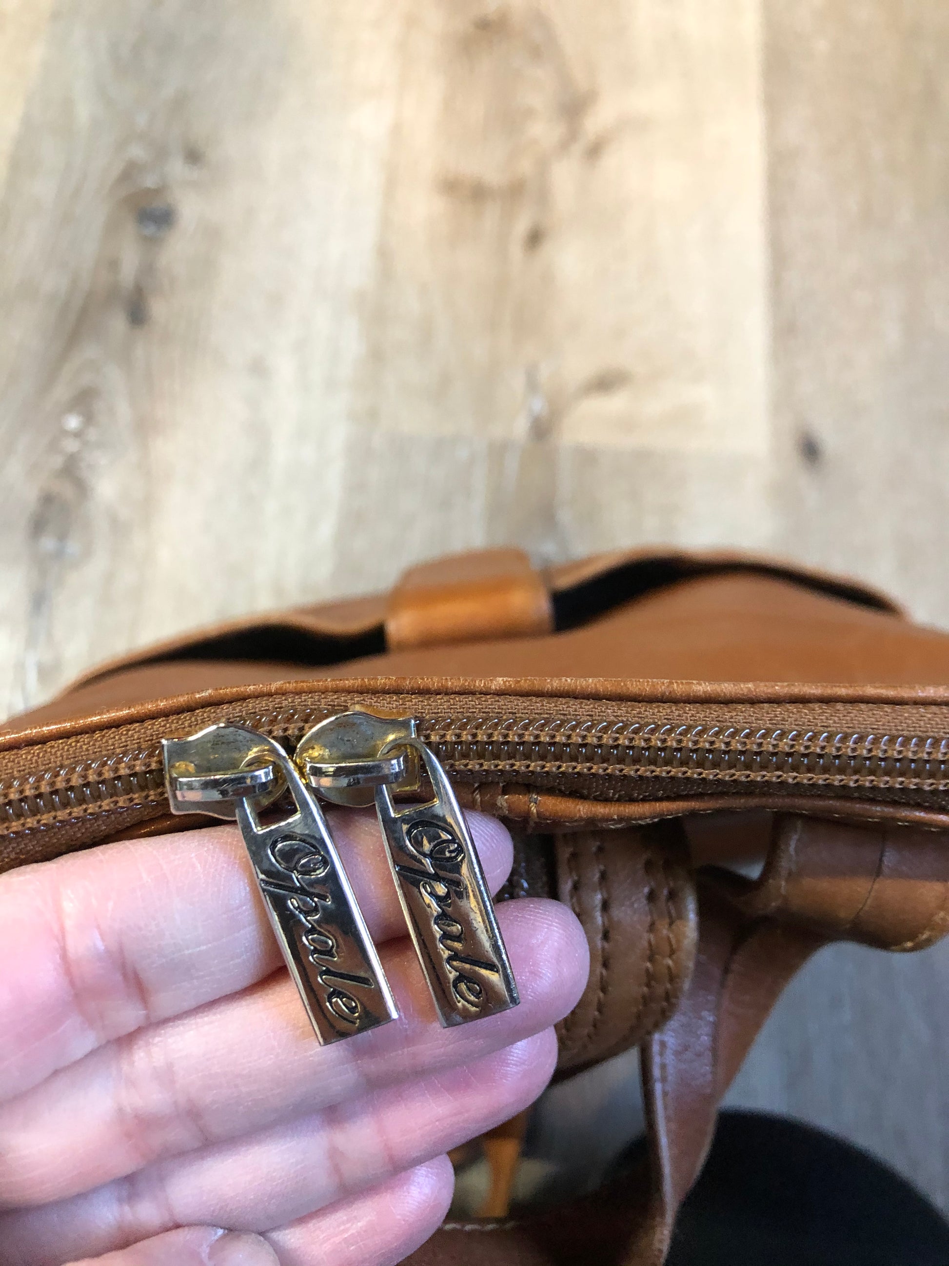 Opale caramel brown leather backpack with top carry handle, zipper closure, shoulder straps can be zipped up into one crossbody strap, one exterior pocket and many smaller compartments inside.