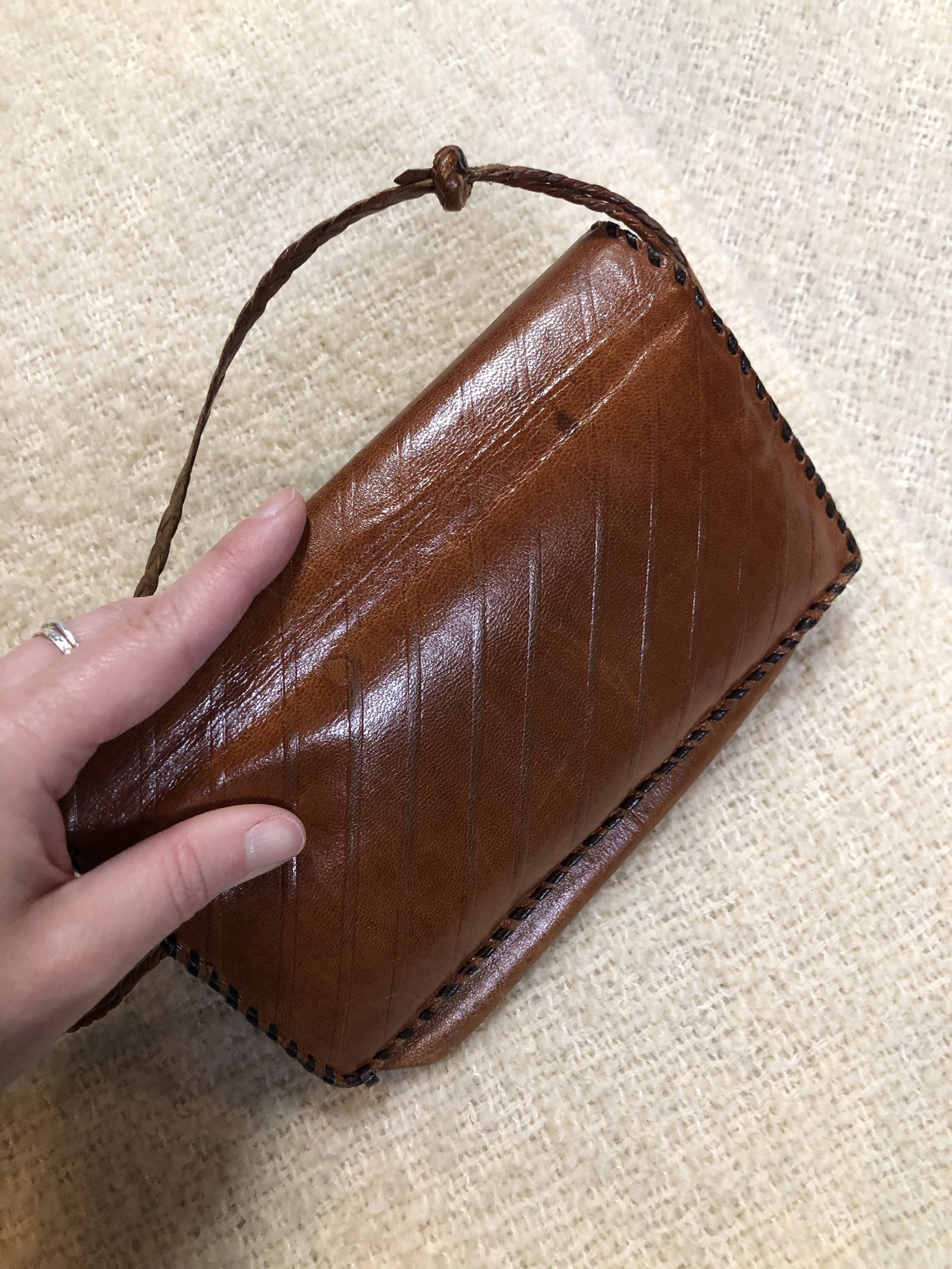 Vintage brown leather crossbody bag with leather stitching, unique front closure and braided shoulder strap.
