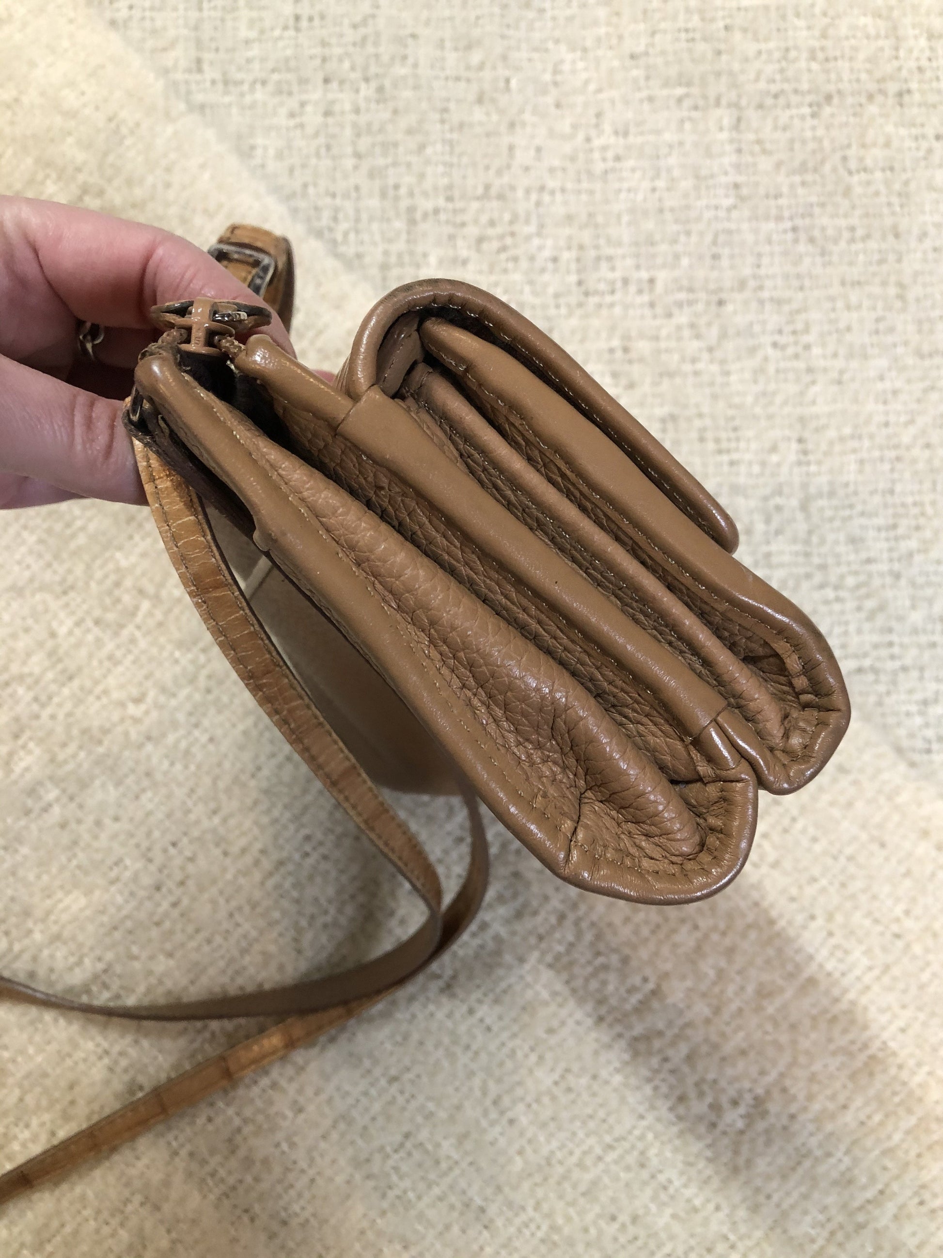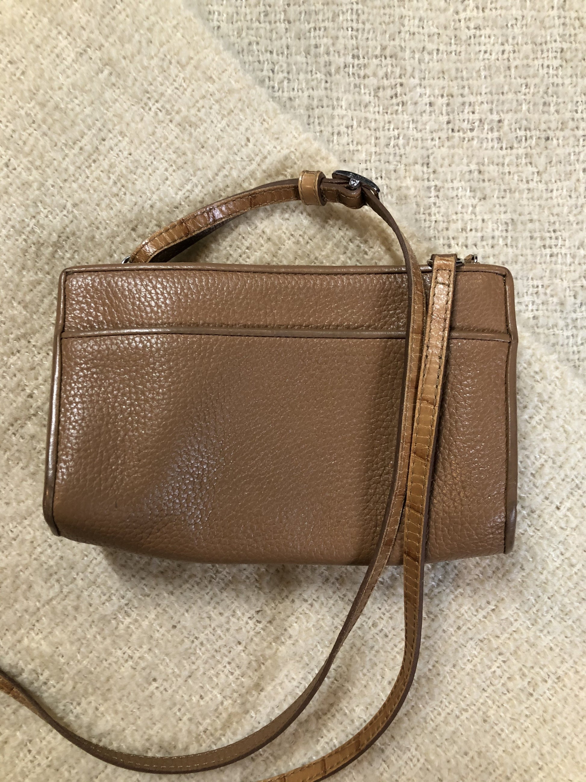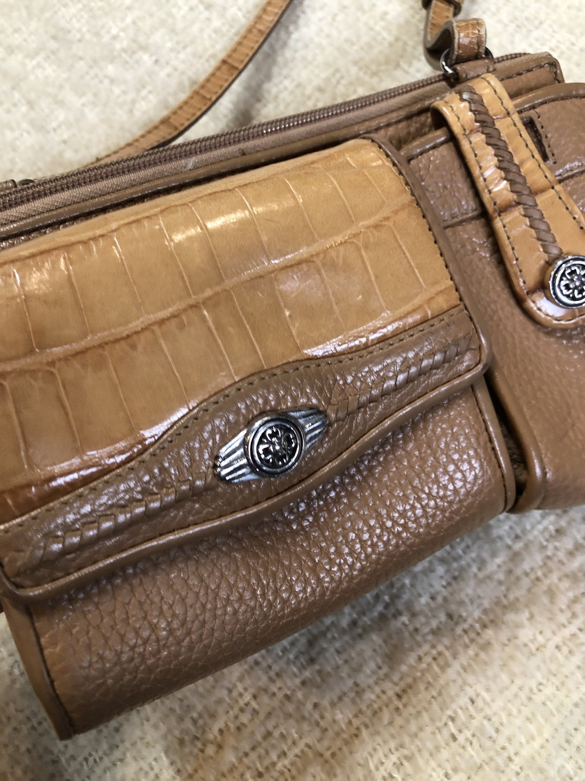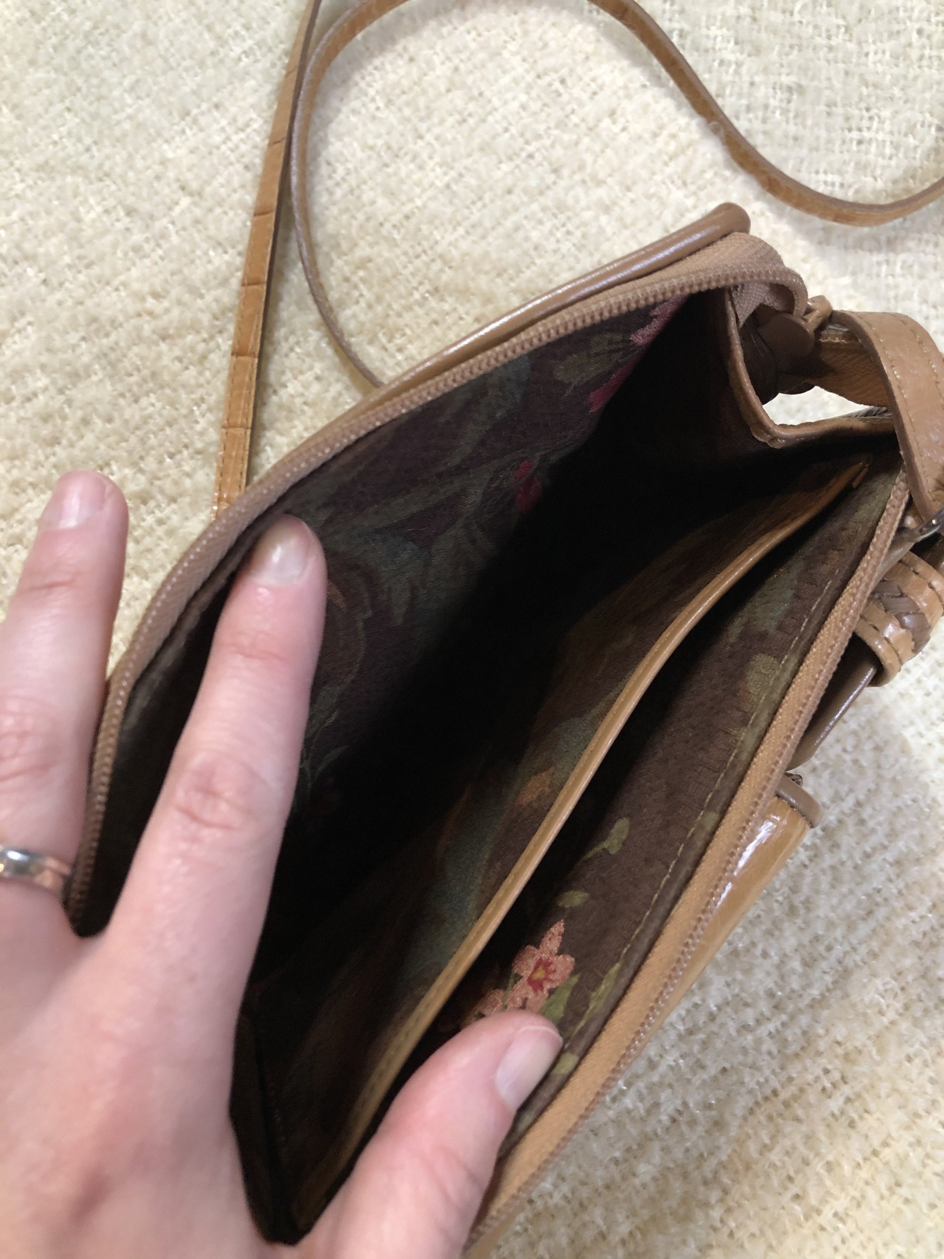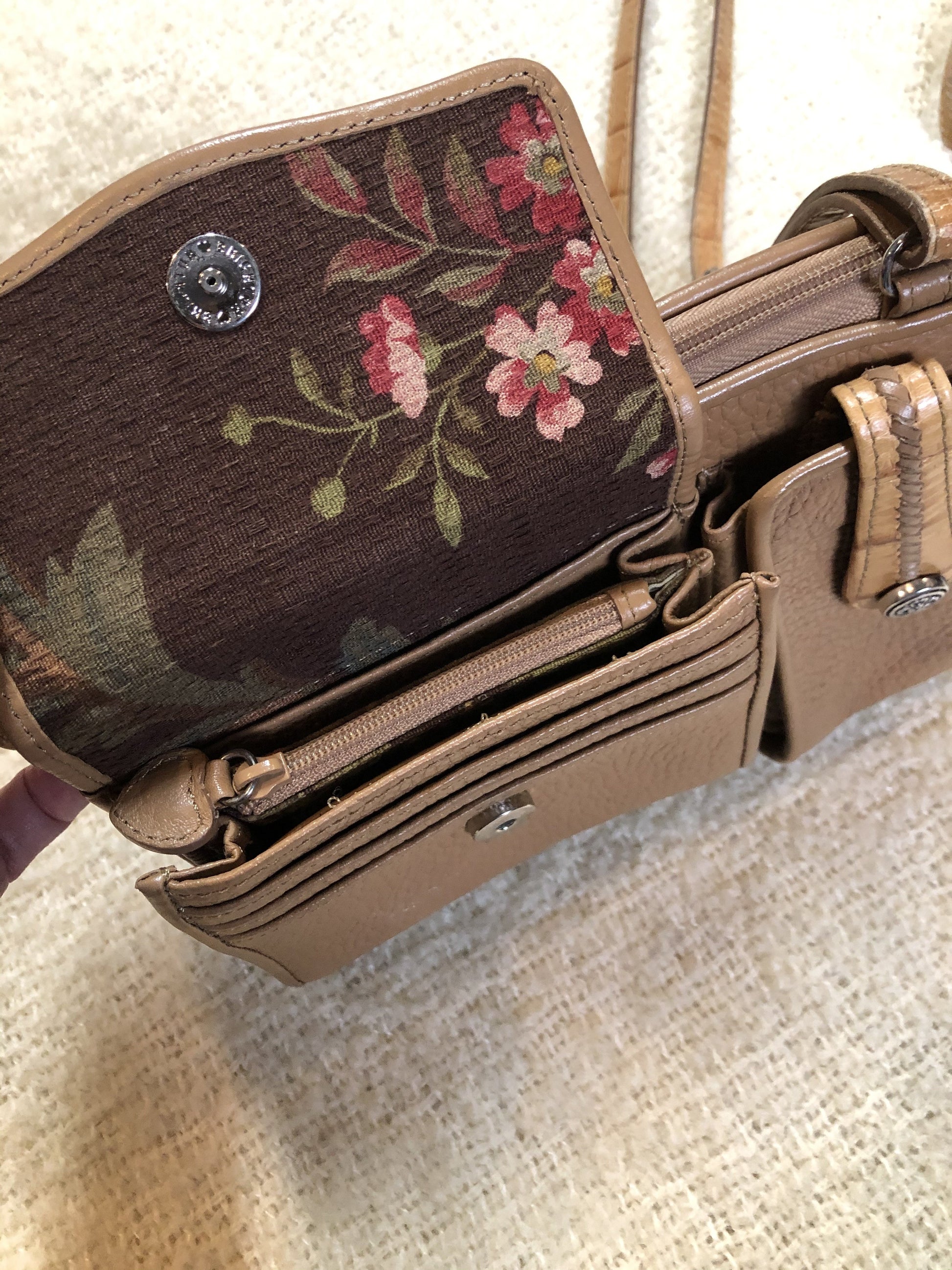 Light brown pebbled leather crossbody bag with croc- embossed details , adjustable shoulder strap, many zip pockets and floral motif lining.
