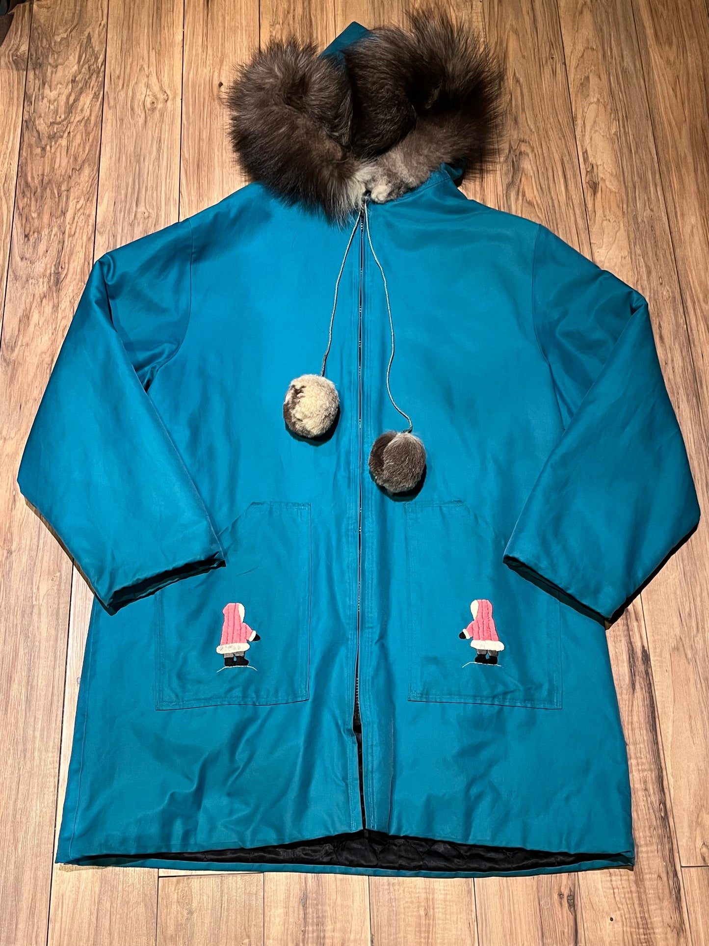 Vintage teal northern parka with fur trimmed hood, fur pom poms, zipper closure, patch pockets in the front and hand embroidered details.